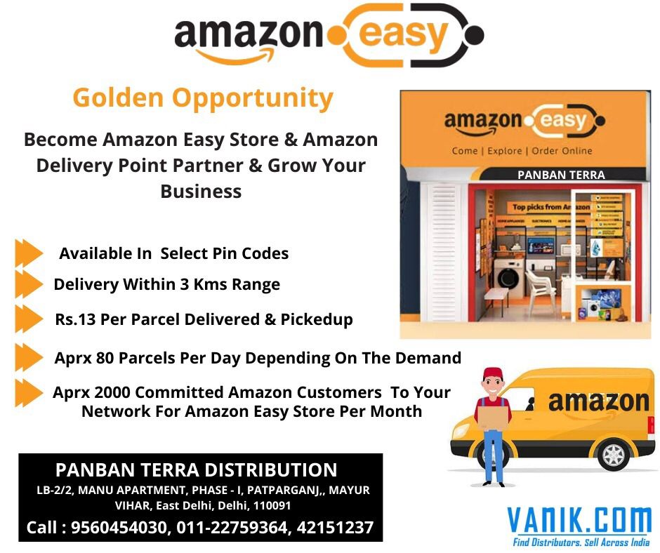 Panban Terra Distribution is the Authorized Partner of AMAZON for roll out of their Easy Stores program across India. Amazon Easy Store is a 'Store In Store' where retailers will help consumers place orders on Amazon website and earn commission from each transaction. All 17 crore products of Amazon will be available to order. No stocking of any kind required. Amazon, with its partner will provide necessary App for order booking, training etc. This is a golden opportunity for anyone wishing to make good income without having to stock products. The retailers are free to choose whether they want to do the doorstep delivery and earn extra commissions. The organization promises attractive commissions and bonus. Interested partners with Retail outlet, laptop and internet facility may contact at the earliest.