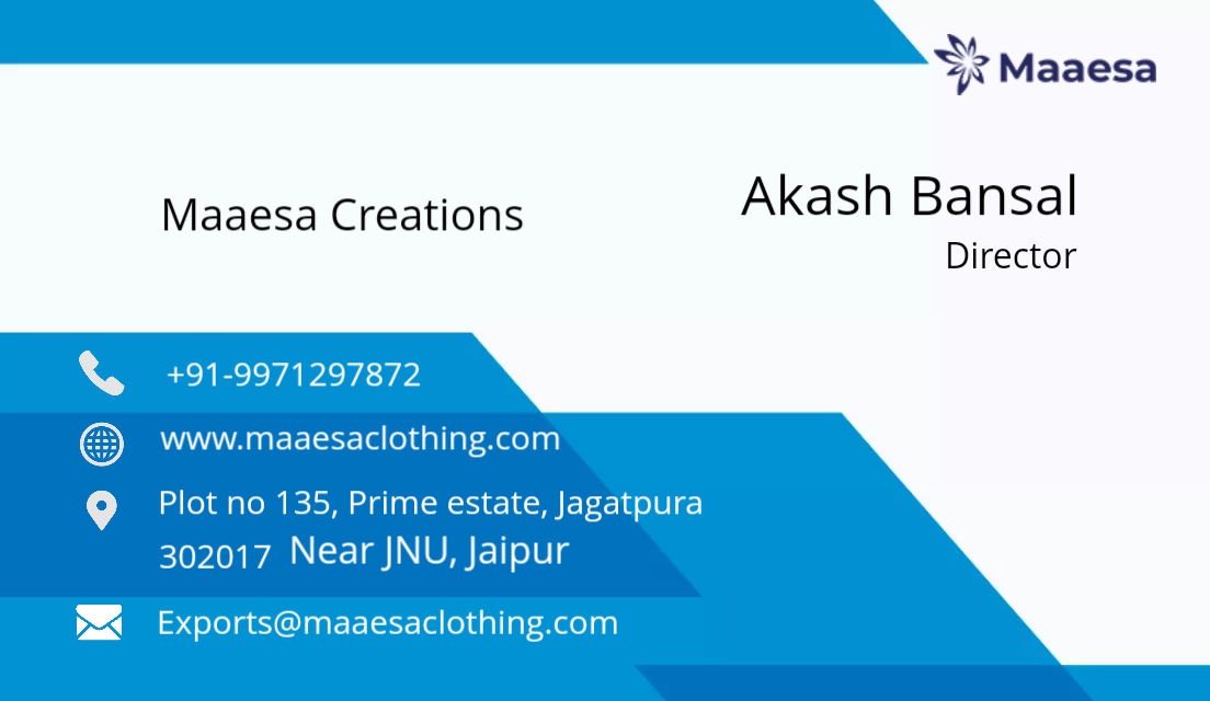 Maaesa Creations is one of the finest manufacturers of ladies' garments based in Jaipur. For around last 5 years, we have been offering most trendy designs and ideas with our brand name maaesa Women 's Wear. Our expert fashion designer team regularly comes up with new designs and concepts.Our major products on offer are Ladies' Kurti and Kaftans. We are looking for Distributors/ Superstockists of Readymade Garments, Apparel across India. The partners with basic infrastructures and market network may contact us at the earliest. For any query please feel free to contact us