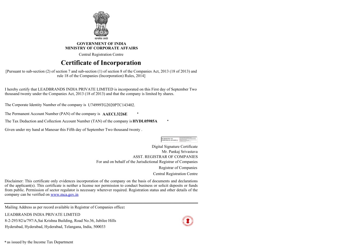 | Company Name | : | Leadbrands India Pvt Ltd |