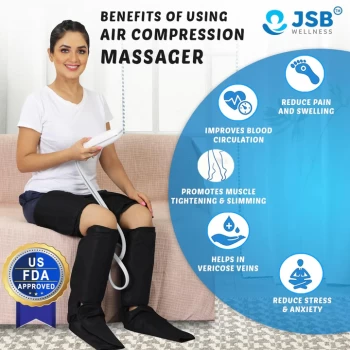 The JSB HF166 Air compression massager machine India with heat for foot, Calf, thighs, & arms pain relief works altogether on the muscles. Which generally occurs while working, sitting or standing for long hours. The airbag compression massage of this leg circulation machine puts the pressure on the muscles to reduce the pain. It's a compact and portable massager which can be used as a free size sleeve.